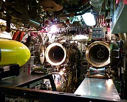 The submarine has been very well restored. In the forward torpedo room the majority of the equipment is still in place. One of the torpedo tubes is open and lit giving you a good view of its interior. Looking up to the ceiling you'll see the Escape Trunk, a compartment that could be flooded and drained in order to allow crewmen a chance to escape should the sub sink to the bottom. It is very well lit and you can get a good look inside.